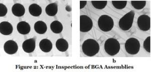 BGA測試的最先進方法是X射線檢測。 通過使用X射線,我們可以簡單地了解該過程的更清晰畫面。 當完整的PCB經受X射線測試時,所獲得的圖像清楚地顯示球形網格,從那里可以可視地分析不能光學檢查的連接。 X射線檢測也可以與BGA裝配過程一起實時進行,以持續監測質量,因為這也有助于我們檢查傳統技術無法分析的接頭,這是迄今為止更好的選擇。另一個非常常見的問題是BGA連接的“爆米花”。 當BGA的變形增加時,它會導致某些焊球在焊接過程中合并在一起,從而導致組件的“爆裂”,如圖3所示。當X射線檢測完成時,這很容易找到。 這里需要注意的是,這種影響可能不容易通過光學檢查來檢查,因為連接的爆裂可能在包裝的中心并因此從側面看不見。 因此,X射線檢測為BGA裝配工藝增添了非常有價值的優勢。