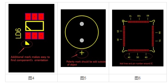 在絲網(wǎng)上的微芯片(IC)上添加針腳和線數(shù)的測(cè)量標(biāo)記,如圖6所示。在組件對(duì)象標(biāo)記的外面放置圖5中正極標(biāo)記的極性標(biāo)記。 對(duì)于像大容量電容器或其他具有特定極性的元件這樣的元件,可以減少電路板裝配過(guò)程中元件方向錯(cuò)誤的可能性,從而使工藝更平滑。