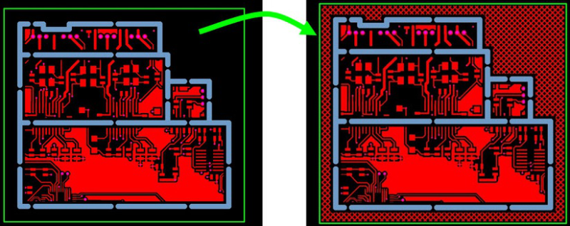 另一個例子是“銅平衡” - 許多PCB設計使用大面積銅區,如果將PCB放入面板以輔助制造過程,則會導致銅不平衡。 這可能會導致面板在回流期間發生翹曲,因此推薦的解決方案是在面板的廢棄區域添加“銅平衡”,如下所示: -