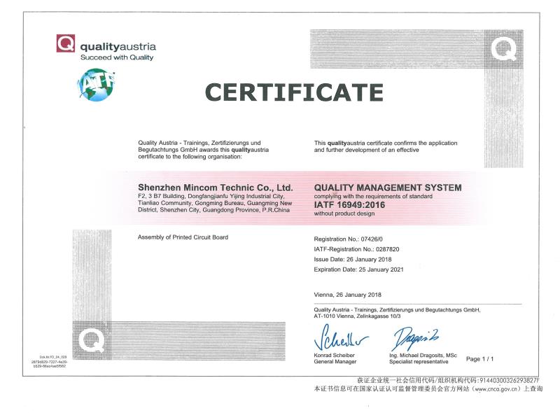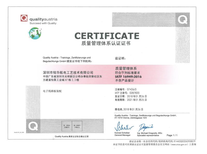 銘華航電取得電子線路板裝配 IATF16949:2016 質量管理體系認證證書的公告