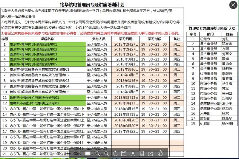 敏華航電2018年,為了建設高效和富有戰斗力的團隊制定了專題講座培訓計劃,銘華航電的市場部,量產事業部,快捷部,供應鏈事業部,研發部,人事部們,每周二,周四晚上19:30-21:00 進行視頻培訓;